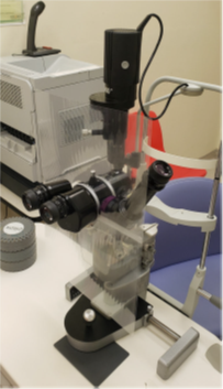 - Diseñar un escudo protector de plástico en la lámpara de hendidura para evitar la propagación de las goticas. Ver figura 2.3