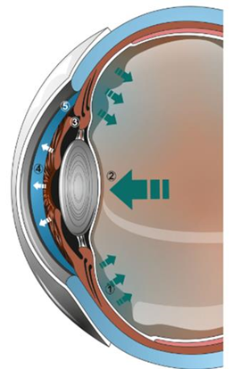 Figura 1. Mecanismo que conduce al Síndrome de desviación del acuoso: 1. El humor acuoso producido no se dirige a cámara anterior y queda atrapado en cámara posterior. 2. Generación de presión positiva desde el vítreo. 3. Desplazamiento de iris y cristalino. 4. Aplanamiento de cámara anterior. 5. Cierre angular.1