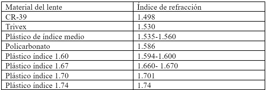 La Tabla 1 muestra el índice de refracción de algunos de los distintos materiales de lentes. Recuerde que cuanto mayor sea el índice de refracción, más delgado será el lente.