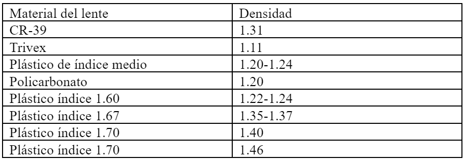El peso de un material de lente se denomina “densidad”. La densidad es una medida de peso basada en una determinada cantidad de material. Se mide la misma cantidad, un centímetro cúbico, de cada material de lente para comparar y el peso se refiere en gramos. Si observa la Tabla 2, podrán realizar las comparaciones basándose en la densidad.