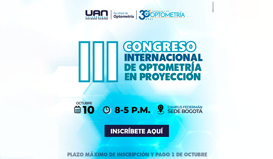 El jueves 10 de octubre de 2024, la Facultad de Optometría de la Universidad Antonio Nariño (UAN) celebrará su II Congreso Internacional de Optometría en Proyección, en conmemoración de los 30 años de existencia de la facultad. Este evento se llevará a cabo en el campus de Federmán en Bogotá, desde las 8:00 a.m. hasta las 5:00 p.m., y reunirá a destacados profesionales, investigadores y estudiantes del ámbito de la optometría.
