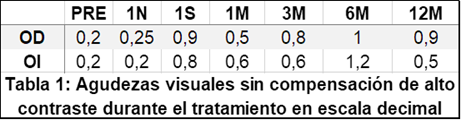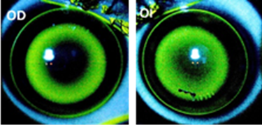 Los parámetros de la lente inicial adaptada obtenida mediante la regla de cálculo del fabricante fueron: OD CRT DA 8,7-500/525-31-10,50 y OI CRT Std 8,7-525-31-10,50. (Imagen 2). La adaptación muestra un fluorograma centrado, apoyo en la medio-periferia y un levantamiento de borde adecuado, la edad del paciente dificultó la obtención de éstas. A los tres meses se realizó un cambio en el radio base de ambas lentes a 8,8 por hipocorrección. (Tabla 2)