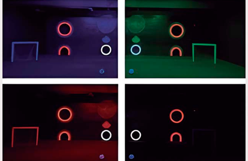 La luz Okkulo de 365 nm es prácticamente invisible para conos y bastones; sin embargo, hace que objetos como balones emitan fluorescencia, permitiendo su visibilidad en condiciones de muy baja iluminación. En estas circunstancias, el procesamiento de los conos puede ralentizarse hasta 50 ms respecto a condiciones normales, mientras que los bastones pueden retrasar su respuesta entre 50 y 60 ms. En niveles de luz mesópica, este retraso puede reducirse a la mitad.
