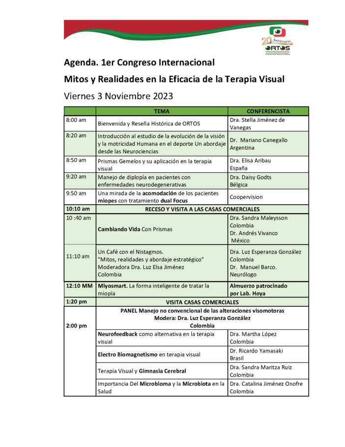 En el marco del próximo aniversario de la Asociación Optométrica Colombiana de Terapia Visual, Ortóptica y Pleóptica, ORTOS, se ha organizado el Primer Congreso Internacional de Ortóptica y Terapia Visual, para conmemorar los 20 años de fundación de la Asociación.