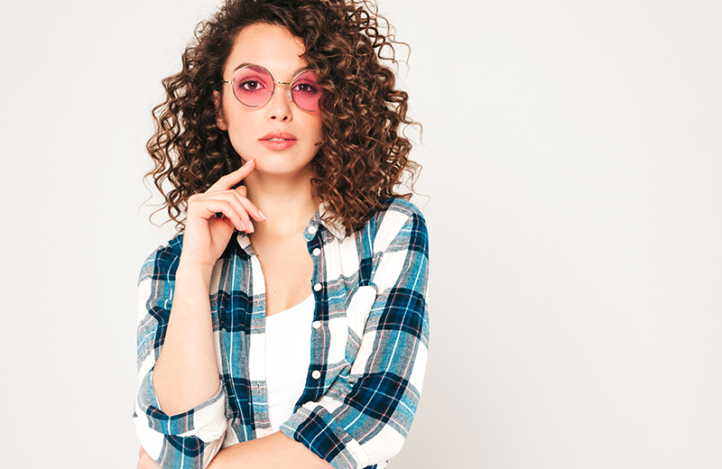 Esta relación es especialmente evidente en usuarios con cabello rizado. Los rizos —ya sean más cerrados o en ondas amplias— añaden volumen natural alrededor del rostro. Ese volumen, si no se equilibra con la montura correcta, puede ocultar varillas, desdibujar contornos o hacer que el marco pierda protagonismo. (The Eyewear Stylist), una firma británica especializada en estética óptica, lo explica de forma clara: “agregar rizos a tu cabello le dará volumen. Los rizos más grandes y sueltos darán la ilusión de una mandíbula más delgada y permitirán que tus gafas resalten y enmarquen tu rostro”. La frase evidencia un punto clave para la asesoría: cuando el cabello crea expansión lateral, las gafas necesitan presencia visual, ya sea mediante color, estructura o formas definidas. Por eso, en estos casos funcionan especialmente bien los acetatos con personalidad, los diseños de contorno nítido y las varillas que logran sobresalir ligeramente entre los rizos, aportando un equilibrio que ni compite ni se diluye.